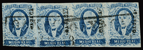 #1 var., ½r Blue "Oaxaca", double impression, horizontal strip of four, slightly cut into in small places, cancelled by framed Oaxaca datestamp, faint strike leaving the design quite clear, couple of pressed out vertical creases, one between adhesives, which are not visible on front, fine.