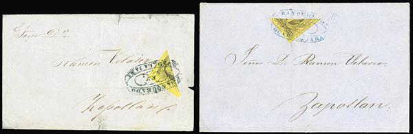 #9a, 1861 4r Black on yellow bisect, Guadalajara, two large margined diagonal halves, each used as 2r on two separate covers to Zapotlán, both tied by oval 'Franqueado/En/Guadalajara' handstamp (Schatzkès 293), infrequently used in blue, one item with slight horizontal crease, the other being very fine and accompanied by1983 Jaretzky certificate.