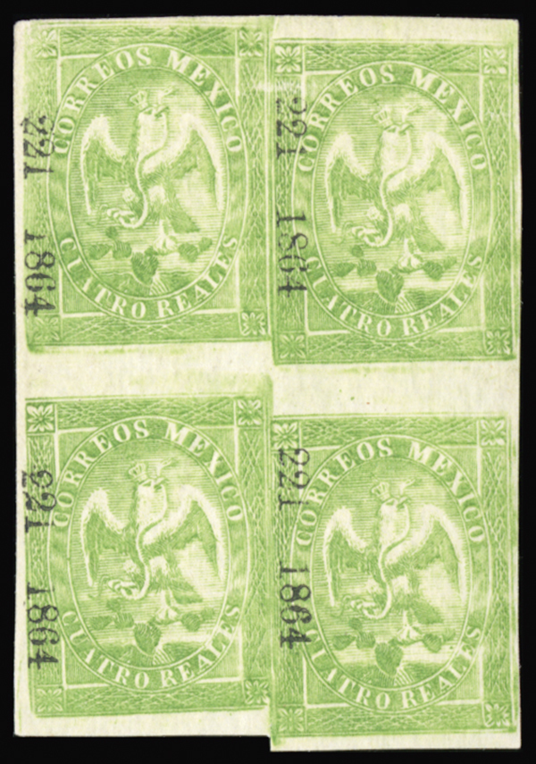 #24,1864 4r Green, Ciudad Victoria, invoice '221-1864', without District name, clear printing on white wove paper, a well margined mint block of four showing misplaced alignment of transfers, o.g., very fine; this block originates from an unused stock of which 294 examples remained unsold; 2015 Todd certificate.