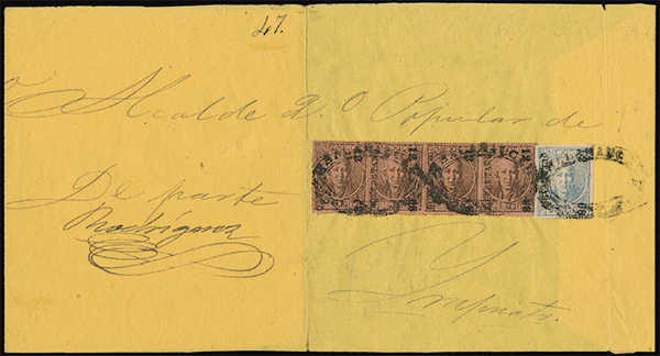 #61, 100c Brown on Brown perf., thin figures, Querétaro '12-68', pair and two singles, and 25c Blue on Pink, thick figures, used on large judicial cover front only to Irapuato, tied by Salamanca double oval postmark (Schatzkès 1331), very fine; a very rare and probably unique franking; 1983 Jaretzky certificate (Follansbee quotes each 100c value at $600.00).