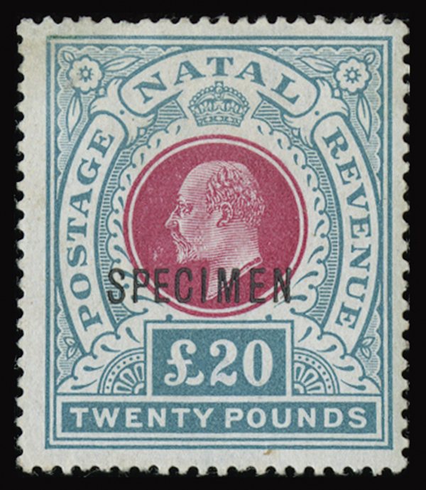 #100s, 1902-03 £20 Green and carmine, overprinted "Specimen", fresh colors, o.g., l.h., owner's handstamp on gum not showing through and nibbed perf. at top, otherwise very fine (S.G. #145b; £600).
