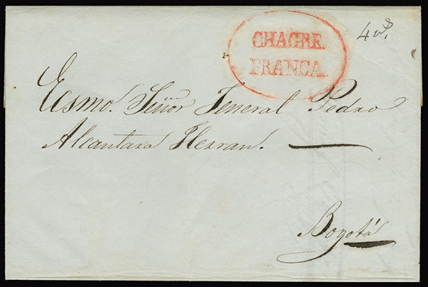 "Chagre./Franca" red oval handstamp, a magnificent strike in red bright color, harmoniously applied on November 21, 1844 folded letter from Chagres addressed to General Alcántara Herrán at Bogotá, paying a long-distance internal rate of 4 reales for a single weight in manuscript at top right, superb, one of only two covers recorded with this postmark, this being unique outside Panama, a major gem of Panamanian postal-history.