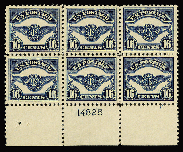 #C5, 16c Dark blue, bottom margin plate no. 14828 block of six, excellent centering, o.g., top center stamp small h.r., the other five n.h., extremely fine.