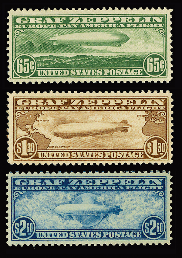 #C13-15, 65c-$2.60 Graf Zeppelins cplt., well centered mint set, post office fresh, o.g., n.h., 65c with a natural gum bend, very fine.