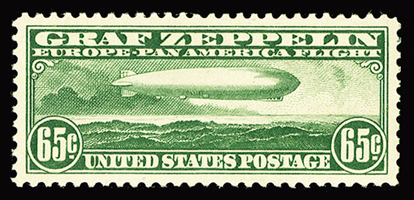 #C13, 65c Graf Zeppelin, exquisite centering, large balanced margins, luxuriant color, o.g., n.h., small natural gum skip at left, extremely fine; 2005 PSE certificate (XF-Sup 95; SMQ $650.00).