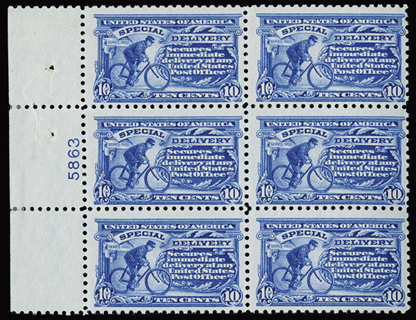 #E9, 10c Ultramarine, left margin plate no. 5863 block of six, vivid rich color, o.g., l.h., tiny h.r. reinforcement at selvedge edge, fine and scarce.