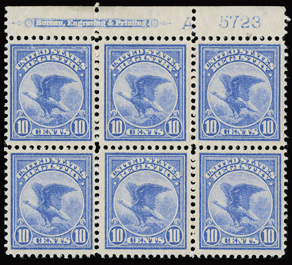 #F1, 10c Registration, an incredibly fresh top margin imprint, letter "A" and plate no. 5723 block of six, well centered, strong and intact perforations all around, pretty pastel color, o.g., n.h., very fine and choice.