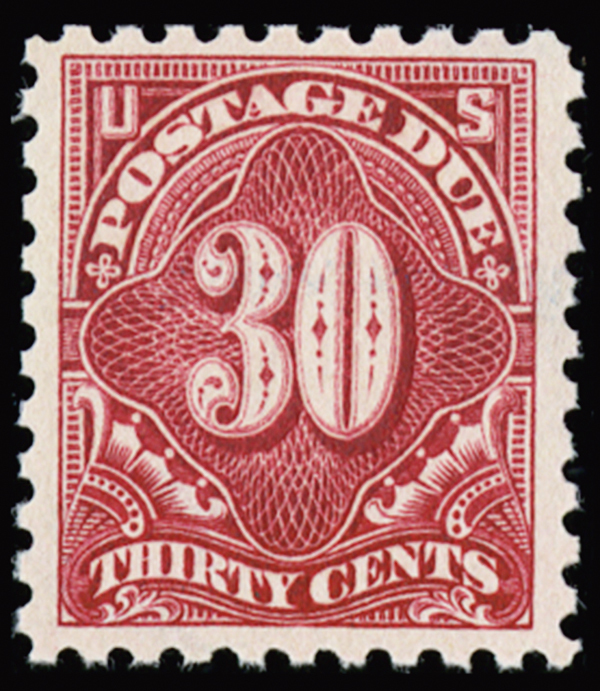 #J57, 30c Carmine lake, post office fresh, intense color and prooflike impression, o.g., n.h., very fine; 2012 PSE certificate for a block of four, this being the bottom left stamp.