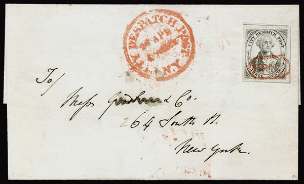 #40L1, City Dispatch Post, New York, N.Y., 3c Black on grayish, large margins all around, cancelled by "FREE" in frame on fresh 1842 folded cover addressed locally, matching "City Despatch Post/N.Y./28 Apr" datestamp, extremely fine; 2017 PF certificate.