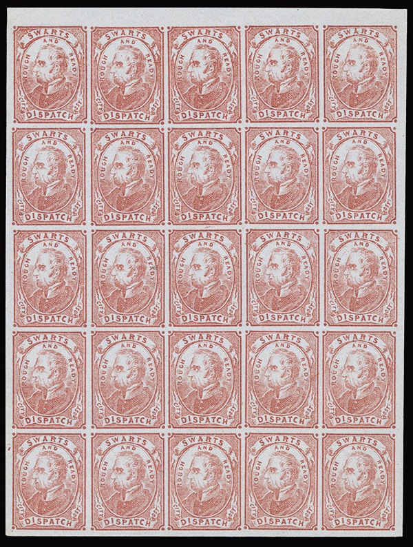 #136L4, Swarts' City Dispatch Post, New York, N.Y., (2c) Red, pane of 25 from stone IV, unused (no gum), wonderfully fresh and clean, extremely fine; 2014 PF certificate.