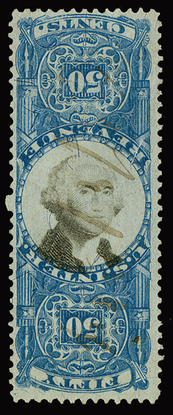 #R115b, 50c Blue and black, Inverted Center, used with light ms. and filled triangular punch cancels, nicely centered and fresh, fine.