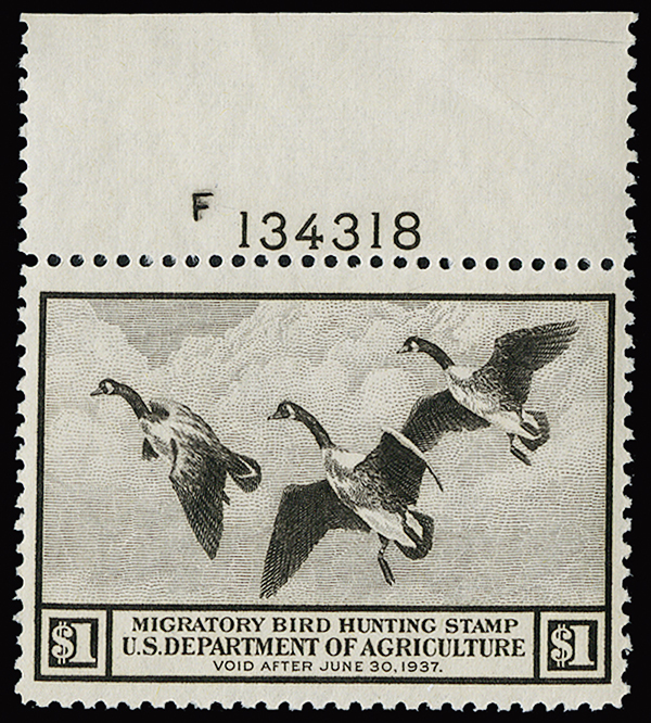 #RW3, 1936 $1.00 Brown black, premium quality top sheet-margin plate no. 134318 single, precisely centered within large margins, pristine o.g., n.h., an extremely fine gem.