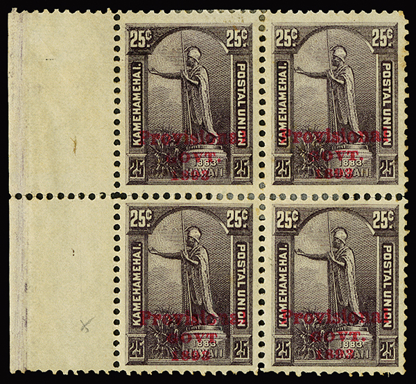 #64b, 25c Dark violet, red "Provisional/Govt./1893" overprint, no period after "Govt" from pos 6, the bottom left stamp in a left margin mint block of four, excellent centering, o.g., h.r., some minor gum tone spots not affecting the variety, very fine.