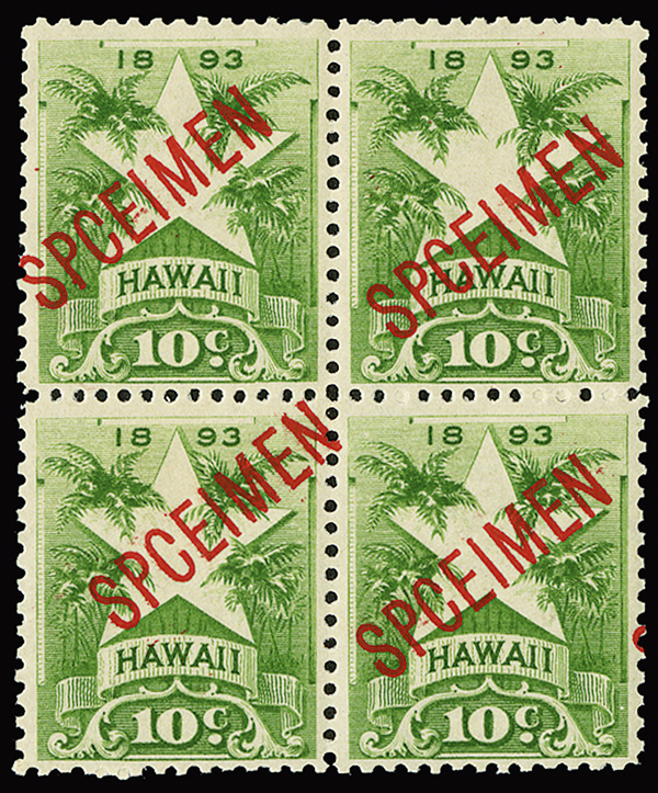 #77S, 10c Yellow green, misspelled "SPCEIMEN" overprint diagonally in red, block of four, pos. UR4-5, 14-15, o.g., n.h., fine-very fine; signed Chang and accompanied by 2015 PF certificate.