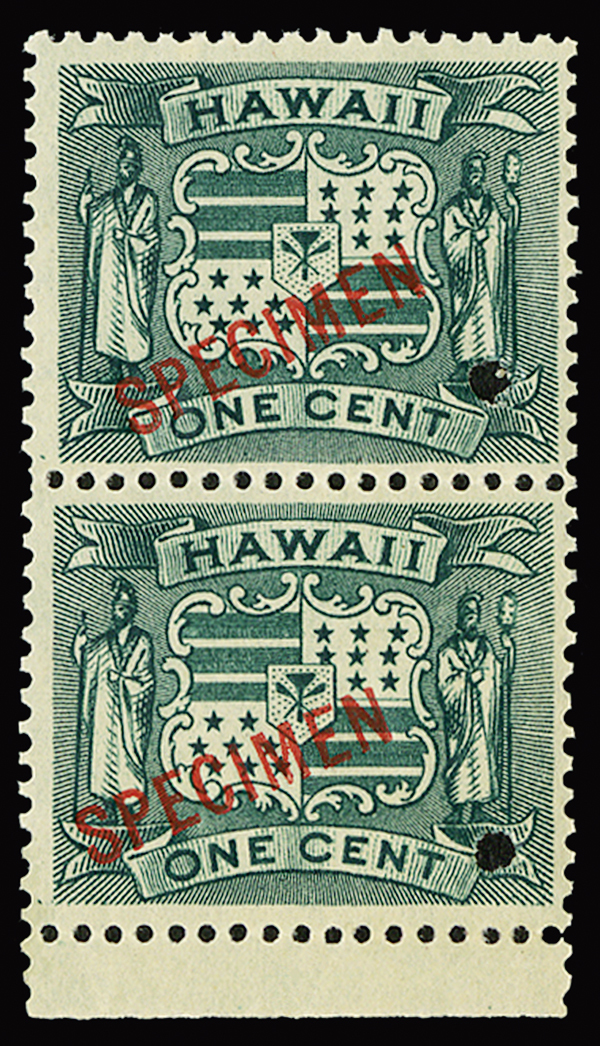 #80S, 1c Dark green, with "Specimen" ovpt. and security punch holes, bottom sheet-margin vertical pair, o.g., n.h., very fine; 2015 PF certificate.