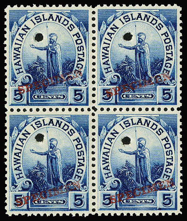 #82S, 5c Blue with red diagonal "Specimen" ovpt. and security punch hole, block of four, well centered, o.g., n.h., very fine; 2015 PF certificate.