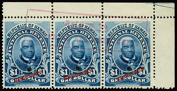 #R11S, $1.00 Dark blue revenue, with red "Specimen" ovpt. and security punch hole, top right corner sheet-margin horizontal strip of three, with additional magenta "Return to Issue Room to be Held for Reference" handstamp, o.g., right stamp l.h. and the other two n.h., very fine; 2015 PF certificate.