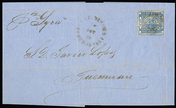 Buenos Aires, Kn #5; GJ #5; 1858 2p ("Dos") Blue, outstandingly neat impression, cut a bit into at right, otherwise outstandingly large margins on other three sides showing portions of four adjoining adhesives, cancelled by "ponchito" handstamp on cover from Tucumáan, carried on a portion of its jopurney along Paraná river as denoted by the "P Syrce" ship endorsement at top left, with "Correos de Buenos Aires/19 Oct 58" datestamp in center; stamp lifted for examination and hinged back in place.