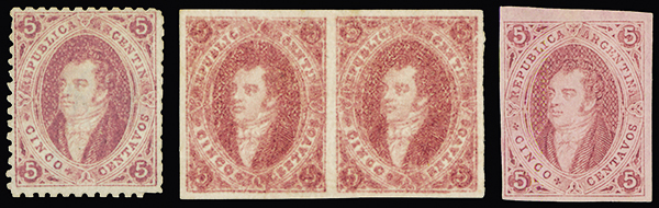 1863-67, "Rivadavia" 5c group of ten plate proofs, five types, all imperforate except one printed on watermarked perforated paper, including one 1866 interesting pair for the 5th Printing on horizontally and vertically ribbed paper in the manner of "quadrillé"; in addition three used examples from the 8th printing and a small group of forgeries.