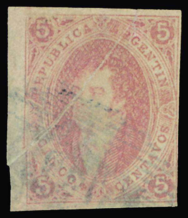 Kn #16f; GJ #16f; 1st Printing Imperforate, 1864 5c Red rose, watermark inverted, additionally possessing a pre-printing paper fold, cancelled by "O.M." barred oval in blue of Buenos Aires; small tear at top commencing in the pre-printing paper fold at top and minute thin spot, nevertheless a desirable and very scarce stamp featuring both varieties; signed V. Kneitschel (GJ $1,200+).