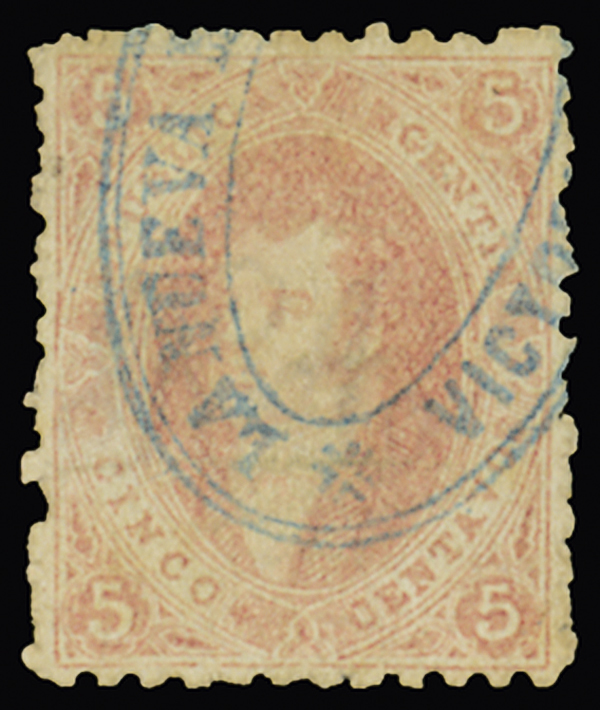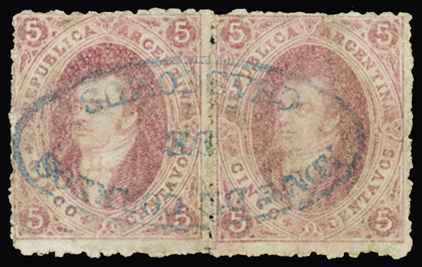 Kn #19; GJ #19; 1st and 2nd Printing Perforated, 1864 5c Brick red, two singles cancelled by scarce "La Nueva Mensajería/Victoria 366" oval handstamp, and pair showing complete strike of Chascomus oval, all struck in blue; fine.
