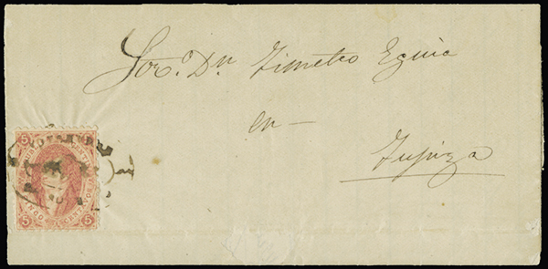 Kn #19; GJ #19; 1st Printing Perforated, 1864 5c Brick-red, on 1868, May 27 folded letter to Tupiza, Bolivia, tied by "rococó" oval handstamp of Humahuaca, Jujuy; small paper loss in center at base of the cover, otherwise fine and rare.