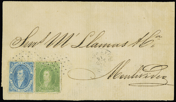 Kn #21c, #22d; GJ #23, #24; 1st to 5th Printings perforated, 1864-66 10c Green and 15c Blue, semi-worn or worn impression, both on folded cover to Montevideo, Uruguay, each tied by dotted oval on dispatch with faint strike of Buenos Aires c.d.s. dated October 21, 1866; paper reinforcement on reverse along horizontal crease clear of the franking, a rare and attractive franking paying a very infrequent quintuple weight cover.
