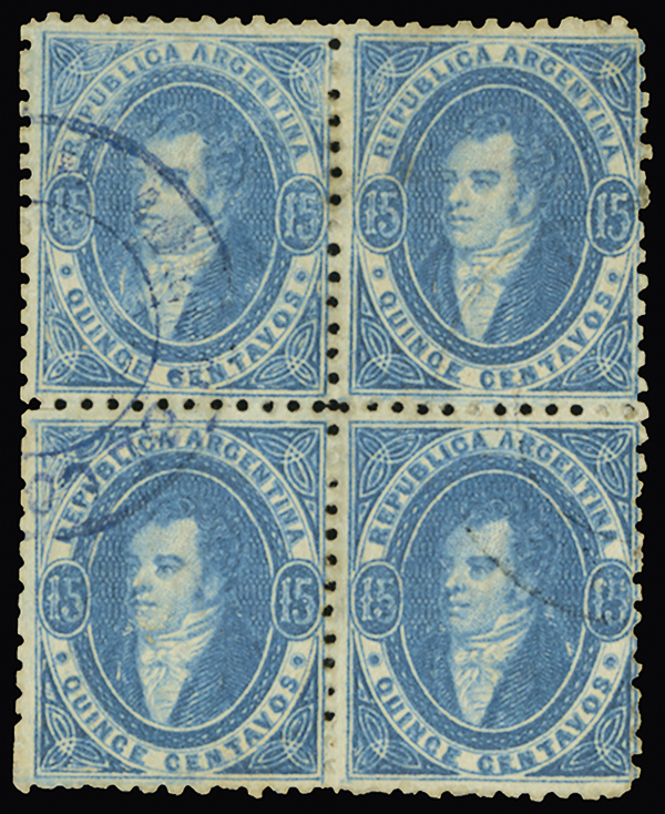 Kn #22d; GJ #24; 1st to 5th Printings perforated, 1864-66 15c Blue, semi-neat impression, a very fresh block of four showing an intense shade, cancelled by "Admon. de Correos" double circle; very slight toning along some perforations and not detracting for this very rare multiple, of which less than five are recorded,