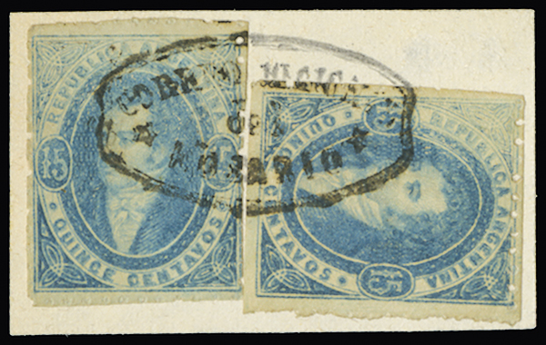 Kn #22, #22d; GJ #23, #24; 1st to 5th Printings perforated, 1864-66 15c Blue, neat and semi-worn or worn impressions, assembly comprising 68 stamps, of which two unused with o.g., interesting usages including one "rococó", registration handstamps in blue or black from Buena Vista, Gualeguaychú, Paraná, Paso de los Libres, Rioja, double circles of Jujuy and San Luis, double oval of Río Cuarto, pre-printing paper folds, one interesting example featuring double partial impression and part of the impression missing, one pair with indistinct and apparently negative oval handstamp, four examples featuring reversed or inverted watermarks including one unused, an unusual cover front to Salto (Uruguay) bearing a single franking; predominantly fine-very fine, viewing essential.