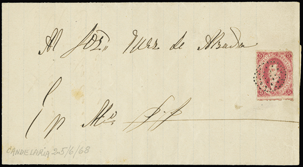 Kn #23; GJ #25; 4th Printing, 1865 5c Rose, group of five covers bearing single frankings in three different shades, all being internal correspondence except for one addressed to Valparaiso, with different cancellations including dotted circle from Candelaria, ovals of Mendoza and Rosario, Buenos Aires c.d.s. and mute oval of La Paz, a fine-very fine group.