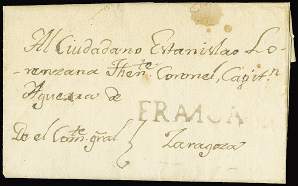 "Franca" handstamp of Remedios on October 28, 1812 folded letter from the General Commander of Remedios addressed to the Lieutenant Colonel and Captain of Zaragoza, with interesting contents concerning groups of soldiers travelling to Zaragoza and the arrival of weapons available, a rare handstamp on scarce military mail during the War of Independence.
