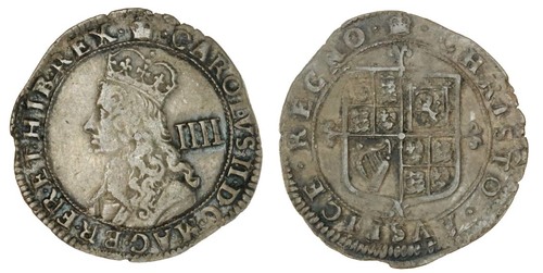 Charles II (1660-85), Shilling, third hammered issue, 5.97g, m.m. crown, crowned bust left, with inner circles and mark of value, rev. square-topped shield over cross moline (ESC 307; S.3322); additionally, Fourpence, similar, 1.95g (ESC 322; S.3324), the first about fine, the second better (2)