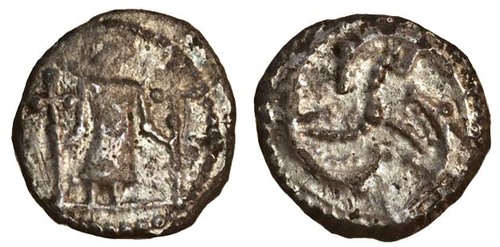 Anglo-Saxon, Sceatta, 0.94g., secondary phase, c.710-c.760, series U, type 23e, whorl of three wolf heads, rev. standing facing figure looking right, holding a long-cross each side (Abr. L700; N.85; S.816 var.), surface porosity, about very fine, very rare