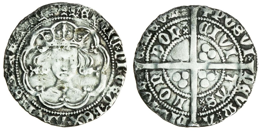 Henry IV or V (1399-1422), Groat, type B2a, London, 3.59g, mm. pierced cross, ‘Scowling bust’, no quatrefoil after henric, Lombardic Ns, no fleurs above crown, mullet on right breast, rev. posvi devm adivtore mevm, saltire stops, civi tas lon don, Lombardic Ns, saltires after tas and don (Potter VIIa; N.1386/1b; S.1762; Stewartby p.324, B2a; BNJ vol.67, pl4/46 this coin), the obverse legend double struck, good fine
