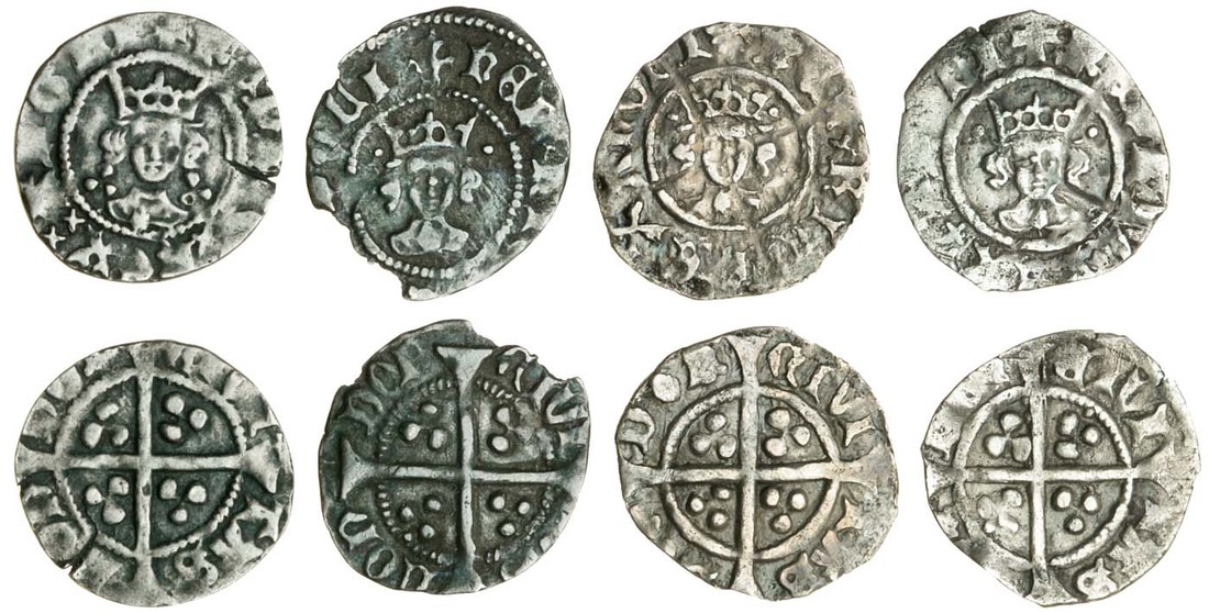Henry VI, (1422-61), Halfpennies (4), London, Trefoil issue, 0.73g, mm. cross V/-, henric rex angli, trefoils by neck, leaf on breast, rev, no marks; Leaf-pellet issue (3), 0.41g, hen ric rex angli, leaf on breast, pellets by crown, rev. extra pellet inner circle by civi and lon; 0.44g, as previous; 0.46g, mm. cross V/-, obv. legend as first coin, rev. extra pellet in civi and lon quarters (N.1500, 1512A (2), 1512B; S.1912, 1928 (2), 1929; Stewartby p.336, VI and pl.22/412 this coin, VIIIa (2), VIIIb), the second chipped, otherwise nearly very fine to very fine, the first rare (4)