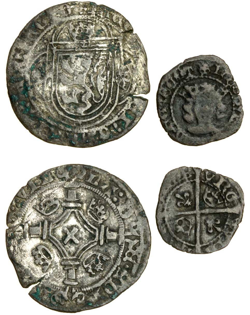 Scotland, James IV (1488-1513), Plack, 2.23g, shield in tressure, crowns above and at sides (S.5348); Penny, 0.50g, Edinburgh, second issue (S.5362), near fine (2)