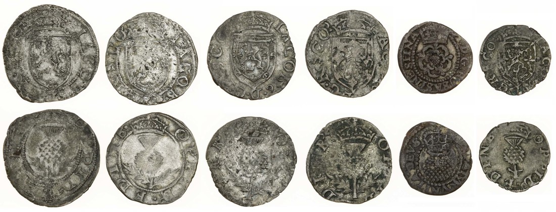 Scotland, James VI (1567-1625), Eightpenny Groats (4), Edinburgh, 1.54g, 1.50g, 1.79g, and 1.84g, crowned shield, rev. oppid edinb (S.5512); Two Shillings or Halfgroat, 1.01g, crowned rose, rev. crowned thistle (S.2659/5509); Twopenny Plack, 1.12g, crowned shield, rev. crowned thistle (S.5515), fine to near very fine (6)