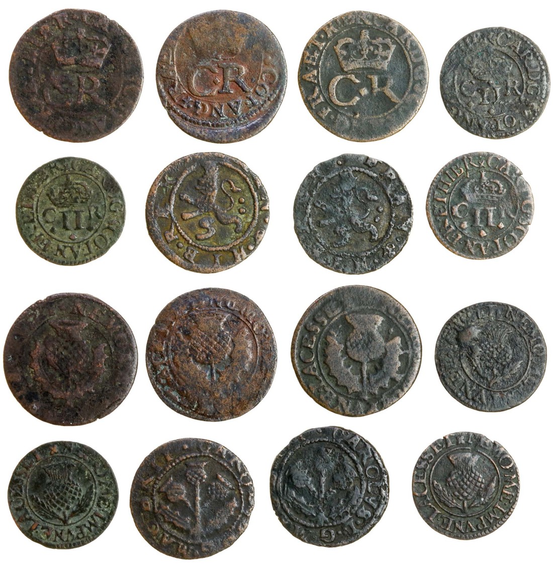 Scotland, Charles I (1625-49), Twopences (8), issue of 1629 (2), 1.82g, crowned three-headed thistle, rev. lion rampant, two pellets behind (S.5596); 1.79g, similar; 1632-9 issue (3), 0.94g, 'English' crown, m.m. lozenge (S.5598); 0.76g, 'Scottish' crown with five crosses, m.m. saltire (both sides (S.5601); 0.83g, similar; 1642-50 issue (3), 2.14g, crowned c r, thistle (S.5602); 2.45g, similar; 2.57g, similar, near fine to good fine (8)