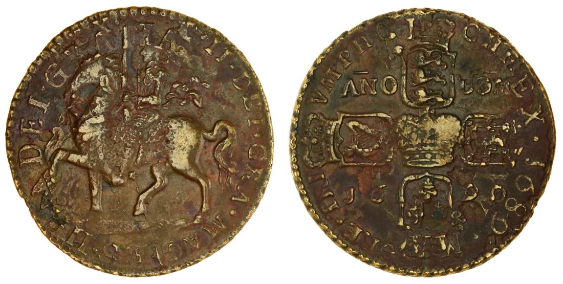 Ireland, James II, 'Gunmoney' (1688-91), Crown, 1690, king on horseback left, rev. crowned shields cruciform (S.6578), good fine, the residual details of the 1689 host coin pronounced