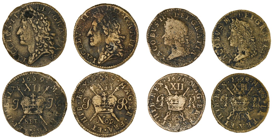 Ireland, James II, 'Gunmoney' (1688-91), Shillings (4), 1689, October - 8ber type, November; 1690, May (2), draped and laureate bust left, rev. crown over sceptres, value above, month below (S.6581F; 6582D), generally fine (4)