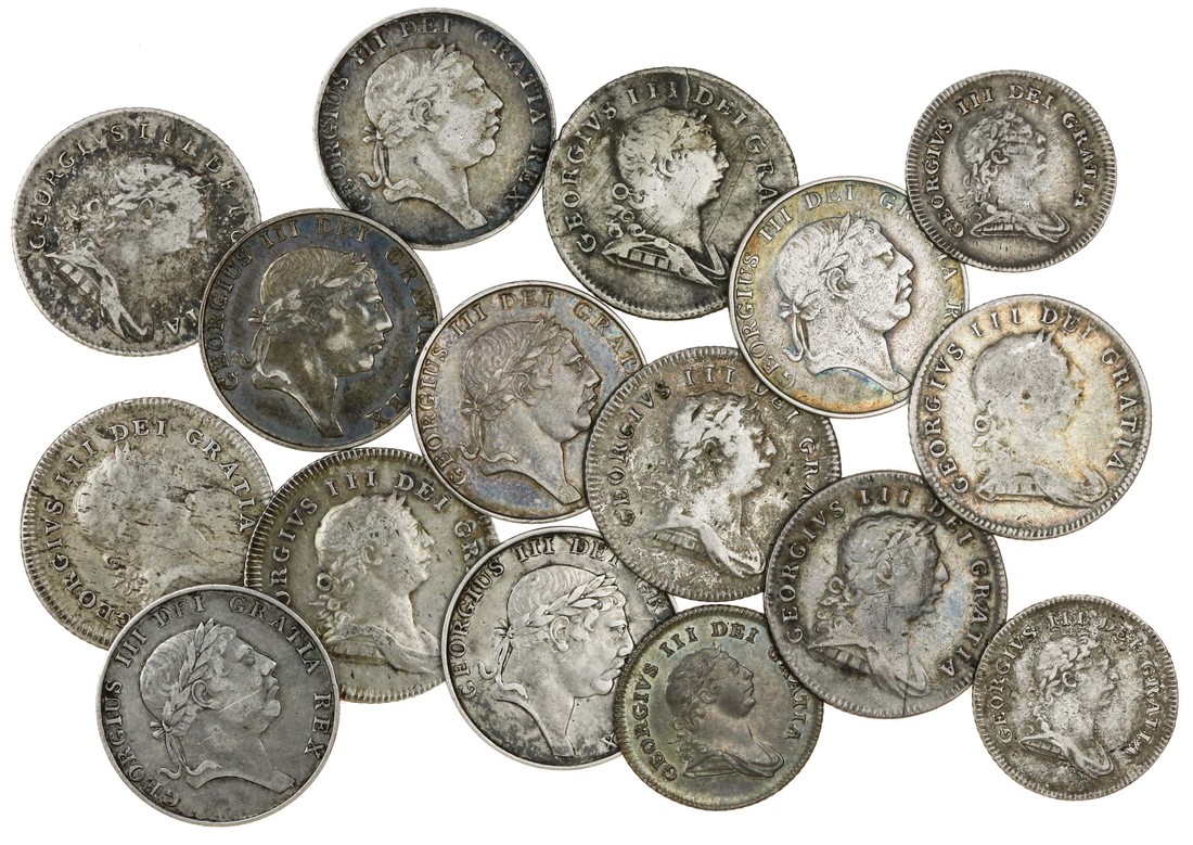 Ireland, George III (1760-1820), Bank of Ireland coinage, Ten Pence, 1805 (6), type I, laureate and draped bust right, rev. inscription across field; 1806, similar (S.6617); 1813 (6), type II, laureate head right, rev. inscription in wreath (S.6618); Five Pence (3), as Ten Pence (S.6619), fine to extremely fine (16)