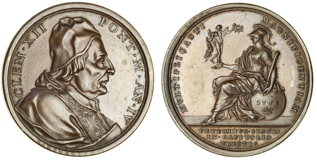 Italy, Vatican, Clement XII (1730-40), on the embellishment of the Vatican Museum, 1734, anno IV, bronze medal by Hamerani, bust right wearing mozetta, camauro and stole, signed on rin hamerani f, rev. Roma seated holding Victory, 36mm. (Bartolotti E734; Lincoln 1787), extremely fine, rich light red/brown patina