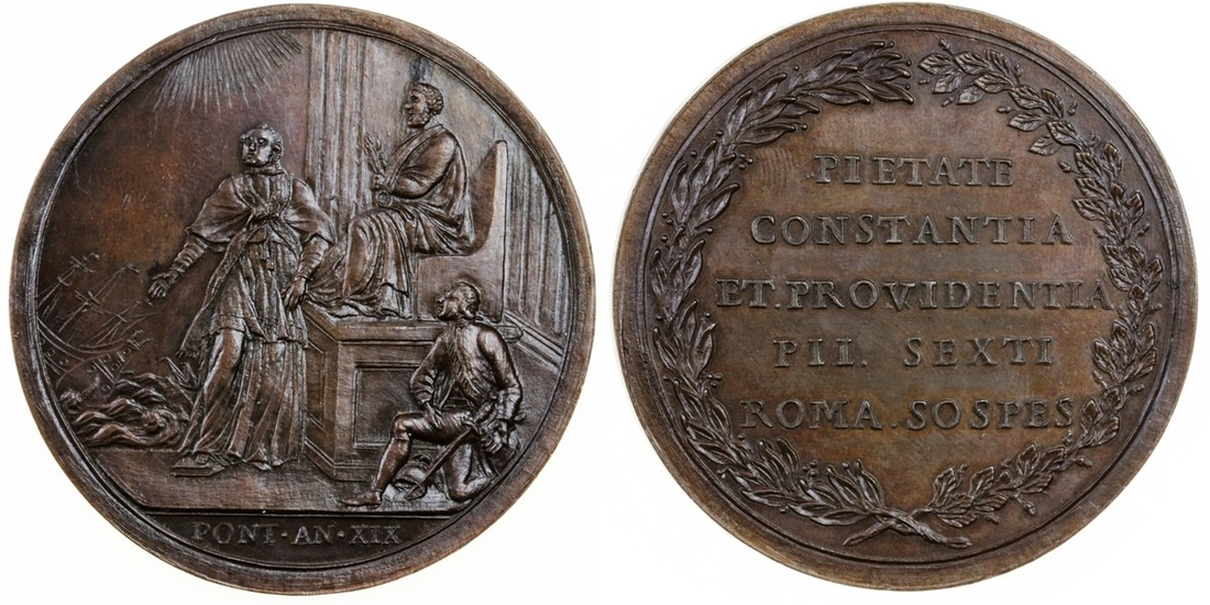 Italy, Vatican, Pius VI (1775-99), Baron de Colli, General of the Papal Forces 1795, bronze medal, Baron de Colli kneeling before Pope who stands beside statue of St Peter, fleet in a storm in the distance, rev. legend in five lines within wreath, 56mm. (Lincoln 1989; Patrigiani 79b; TN Med des Papes 1839, 7), good very fine, scarce