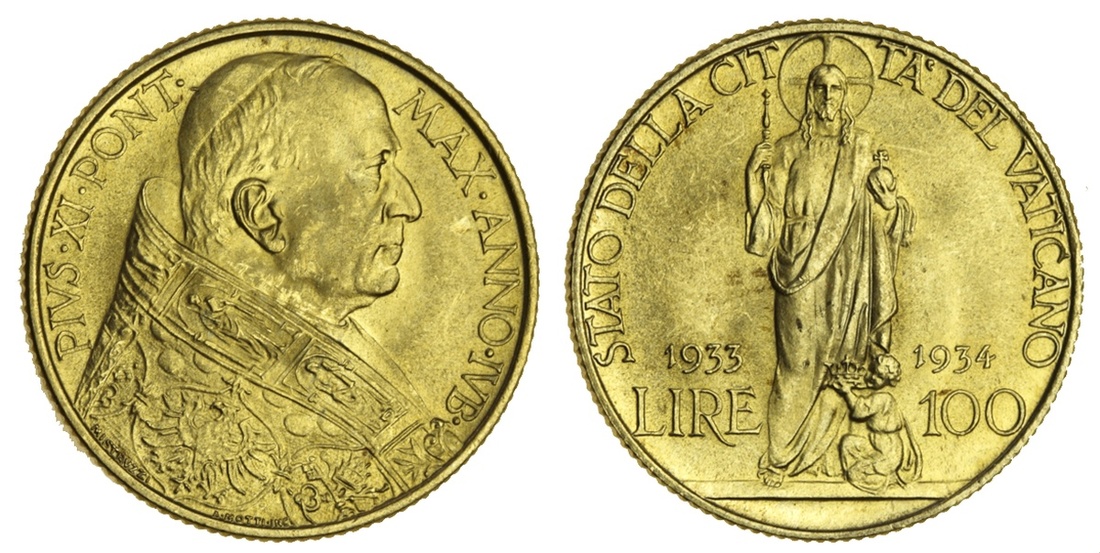(g) Italy, Vatican, Pius XI (1922-39), 100-Lire, Jubilee type, 1933-34, bust right, rev. Christ standing with child at feet (F.284; KM.19), bright and lustrous, about uncirculated