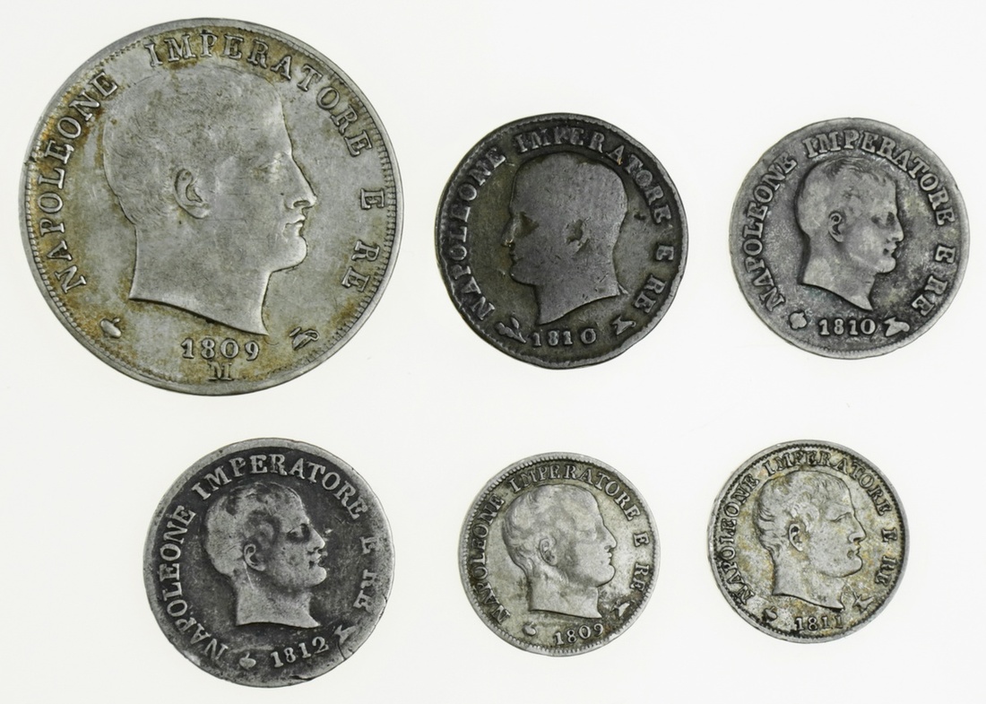 Italy, Napoleon (1804-14), 2-Lire, 1809 (KM 9.1), 10-Soldi (2), 1810, 1812, 5-Soldi, 1809, 1811, all Milan, and Centesimo, 1810B (KM 6.1, 5.1, 1.1), average very fine (6)