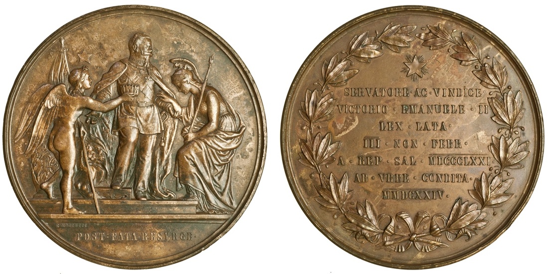 Italy, Vittorio Emanuele II (1861-78), On the Establishment of the Italian Capital at Rome, 1871, large bronze medal by C Moscetti, the King attended by Roma, post fata esvrge in exergue, rev. legend in wreath, 76mm. ( Med. del Risorgimento 1761), extremely fine
