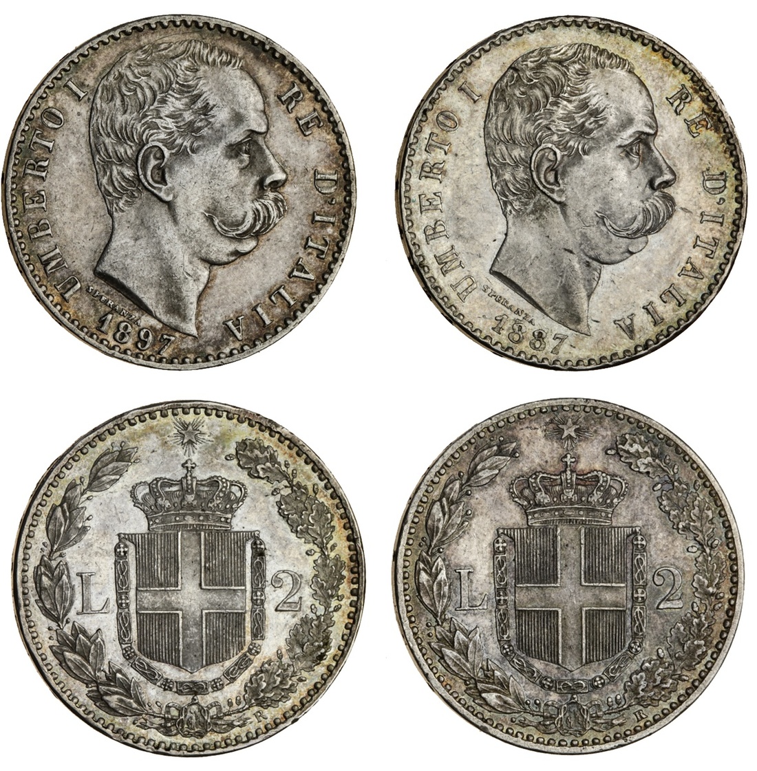 Italy, Umberto I (1878-1900), 2-Lire (2), 1887 R, 1897 R, head right, rev. crowned shield dividing value in wreath (KM 23), extremely fine (2)