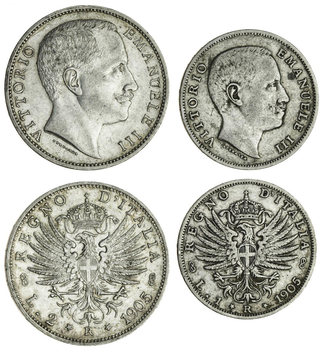 Italy, Vittorio Emanuele III (1900-46), Lira and 2-Lire, both 1905R, head right, rev. crowned eagle with Savoy shield (KM 32, 33), fine and good very fine (2)