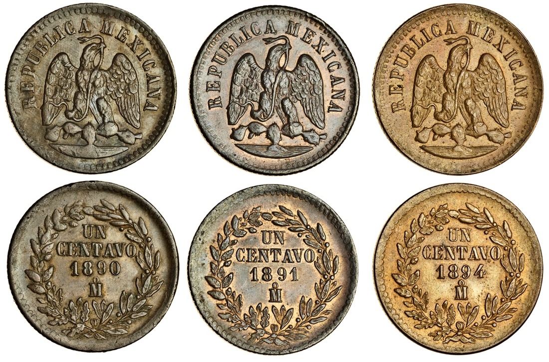 Mexico, Second Republic, Centavo (3), 1890, 1891, 1894, all Mexico City, facing eagle with snake in beak, rev. value and date within wreath (KM 391.6), the first good very fine, the second extremely fine with some lustre, the last good extremely fine with bright colour and lustre (3)