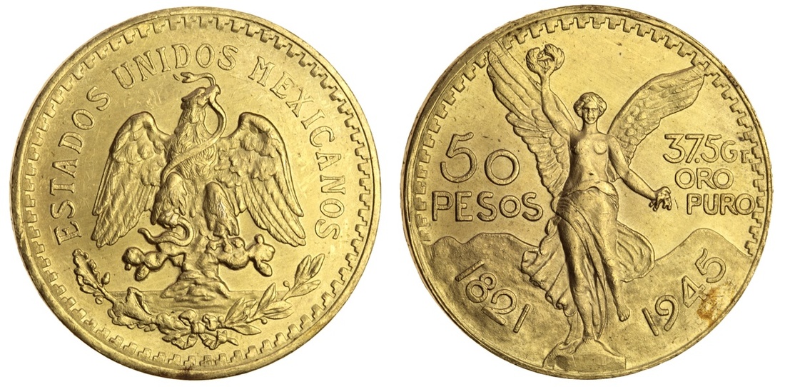 (g) Mexico, Republic, gold 50-Pesos, 1945 (KM 481), extremely fine